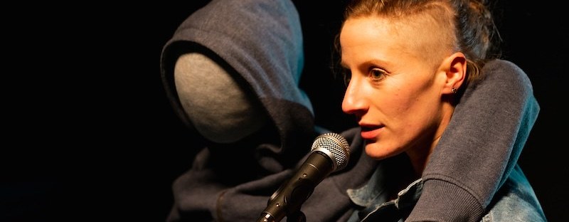 Two puppets assist her. One is life-sized – the self to whom she speaks when she is pondering how the crab first came into her body. The other is half her size, a shrunken and virtually bald image of the self she becomes through chemotherapy, constantly tugging at her inadequate hospital gown, smoothing it down, ‘making herself decent’ – heart-breaking.